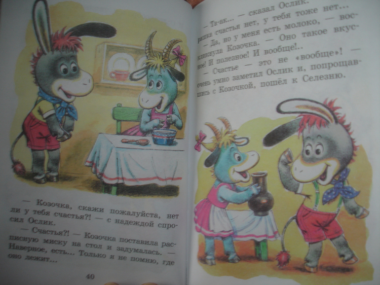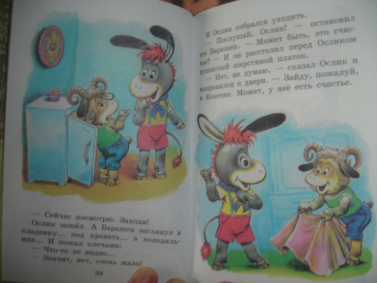 Чуть ниже сборник - "Книга сказок для чтения в детском саду". Маленькая, но очень вместительная книга с чудесными иллюстрациями Савченко. Она покупались как небольшая хрестоматия для поездок куда-нибудь, Саня сам достал. Начинается книжка с подробно иллюстрированного стихотворения В.Орлова «Хрюшка обижатеся» (всегда читаем), «Сказки про умного мышонка» (её тоже читаем всегда. Вот что значит иллюстрации нравятся. Такого успеха у сказки в изображении Бордюга-Трепенюка я не наблюдала). Потом идёт «Как ослик счастье искал» Каргановой, опять же некоторые сказки Пляцковского и коротенькие сказки Цыферова. Пляцковского в этом сборнике почти не читаем, а вот Цыферов в целом понравился. Одна сказка чуть-чуть вскипятила мне мозг: как Телёнок пошёл искать вчерашний хороший день, а Сова начала объяснять, что каждый хороший день - уже сегодняшний, а не вчерашний...Ну, ладно, главное, что Сане она понравилась. Есть в сборнике ещё две мультсказки - «Вовка в тридевятом царстве» и «Петя и Красная Шапочка». По-моему, никак они не вписываются в рекомендуемый на сборнике возраст «до 3-х лет». Да и остальные сказки мы ещё почитаем. Не знаю, может, это у меня ребёнок такой маленький, что нам ещё малышковые книжки читать.