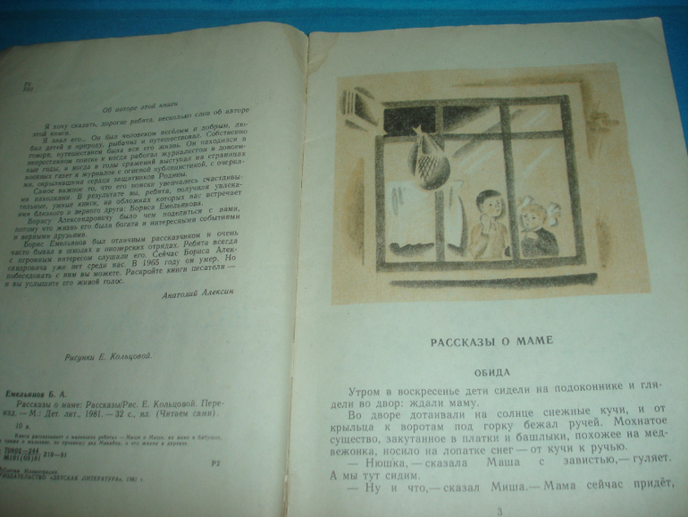 Б.Емельянов - "Рассказы о маме". Сюда ещё входят рассказы из цикла "Дед Макабка". "Детская литература", 1981 г. Рисунки Е.Кольцовой. Та же беда, что и с "Рисунок умывается" - шрифт мелкий и не очень чёрный, бумага не очень.