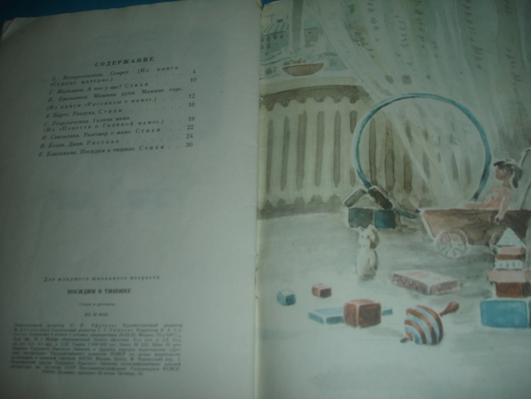 "Посидим в тишине". Стихи и рассказы. Рисунки И.Дунаевой. "Детская литература", 1983г.. Очень любила этот сборник. Потрясающие рисунки, которым тоже не нужен сильный цвет. Есть там рассказ о семье Ульяновых :) Мне в детстве фамилия ни о чём не говорила - Петровы, Ивановы, Ульяновы, какая разница. Очень нравилась мне их семейная идиллия - дети делают подарки маме на День рождения, а потом трогательно дарят.