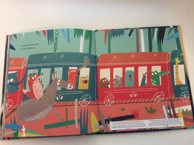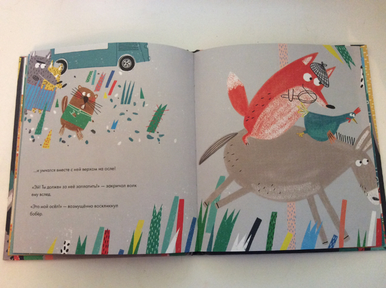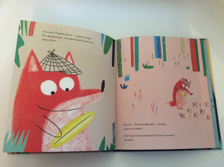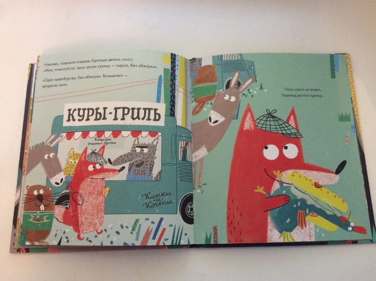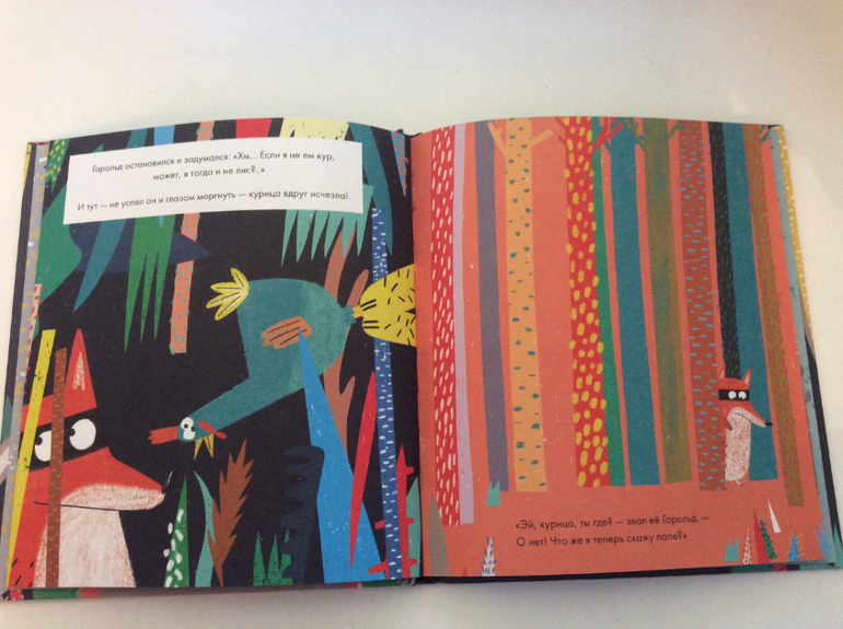 Текста очень мало, но он забавный. Рассказ про лисёнка, который не ел мясо, а папа ему дал задание добыть курицу. И вот он добывает курицу, но теряет её. Ну и далее как он спас эту курицу, перехитрив волков и даже своего папу... Вот последний момент тоже вызывает некоторые сомнения, потому что обманывать родителей нельзя, а тут выходит, что можно. Но если проговорить это с ребёнком, объяснив ему почему лисёнку пришлось хитрить со своим папой, что это было сделано ради спасения курицы итд итп...