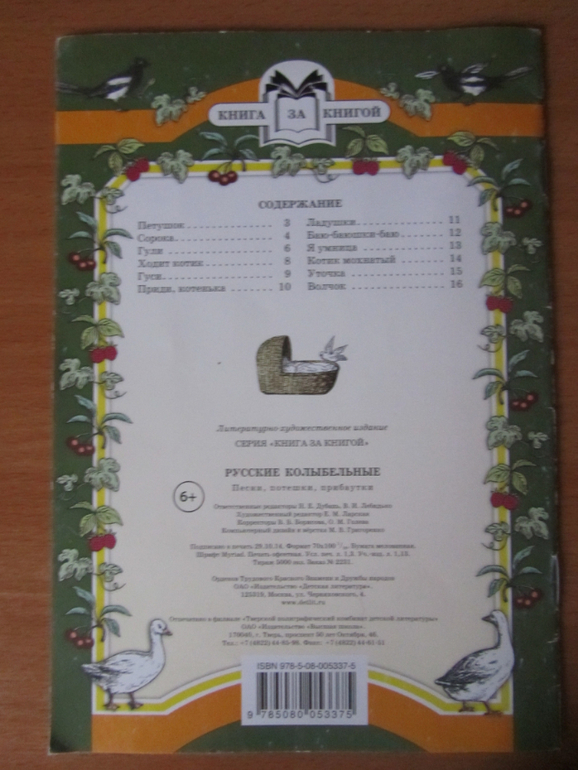 Прехорошенькая тоненькая книжечка с ретро иллюстрациями Гимбеля. В книге собраны известные и мне доселе незнакомые песни, потешки, прибаутки, которые распевали своим малышам матери в старину на Руси. Очень рекомендую!