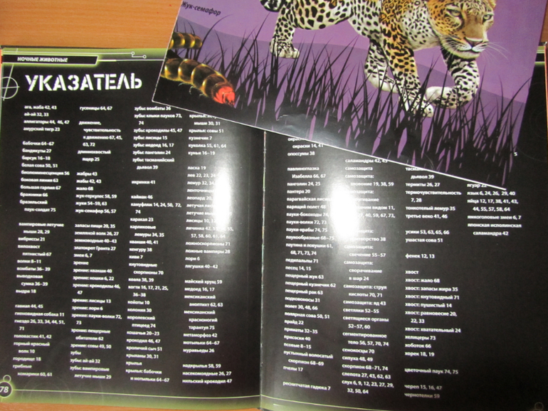 В конце книги есть указатель с названиями всех животных из книги и также в комплект входит большой красивый плакат с теми же животными ))