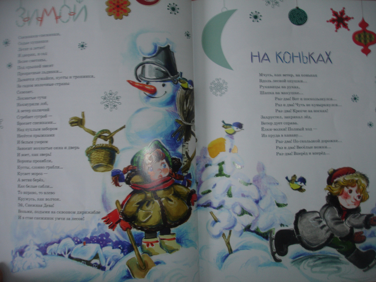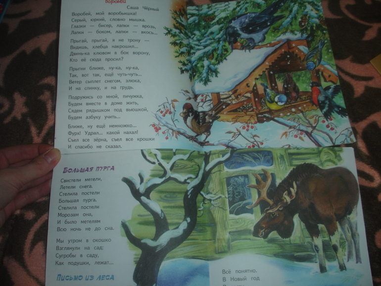 «Зимушка-зима» и «Белая сказка». Серия «Времена года» от "Адонис" мне нравится. Тот вариант, когда можно ненавязчиво почитать про природу. Люди, как по мне, страшноваты, но пейзажи и звери очень даже. Подборка стихов тоже приятная. Конкретно о зимних. Степанов, которого так-то я не особо люблю, здесь вполне хорош, но Саша Чёрный просто великолепен! Сане, кстати, «Белая сказка» тоже заметно больше нравится. У Чёрного такие непосредственные стихи, которые, как мне кажется, понятны и близки детям. Любимые у Саньки - «На коньках» («Раз и два», как он его называет) и «Воробей». А «В хлеву» очень умиротворяюще действует на меня.