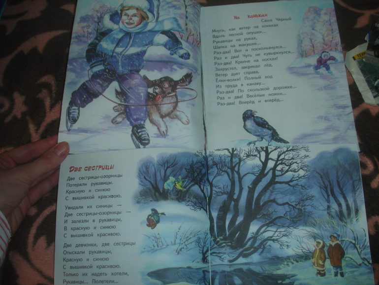 «Уж ты зимушка-зима». Заранее была морально настроена, что Саня откажется её читать. К потешкам он уже давно охладел, и волшебство Васнецова (и не только) на него уже не действуют. Однако же эти стихи мы читали очень часто. Санька узнал Колобка, всё спрашивал, где остальные. О книге говорить бессмысленно- она изумительно-идеальная. Кстати, отпечатана у нас, в Тверской области.