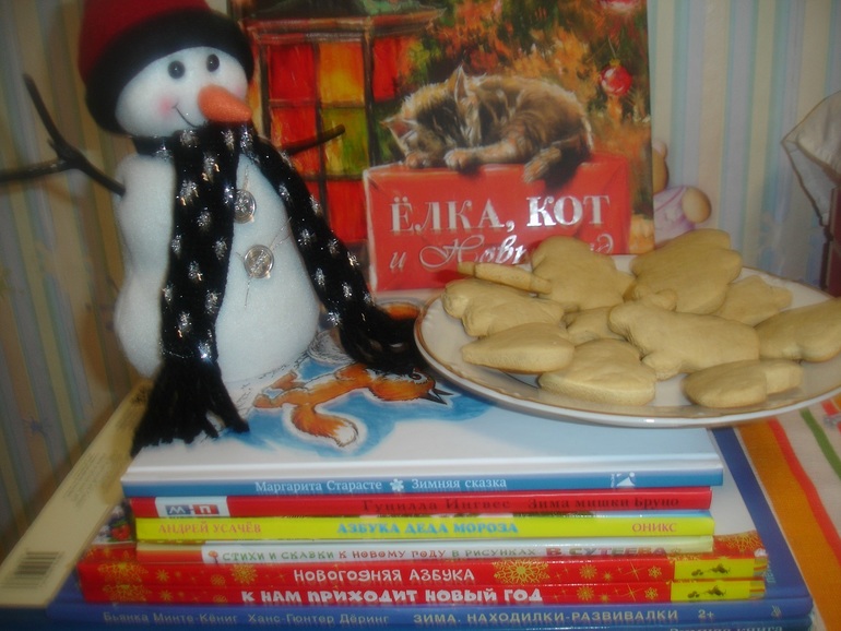 «Зимняя сказка» М.Старасте - самое длинное прочитанное произведение. По моим ощущения, не только новогоднее, а вообще. С первого же раза прочитали всю целиком, не отрываясь. Я ещё не умею разбивать произведения на главы, не знаю, сколько надо читать за один раз, как потом вспоминать прочитанное...и т.д.Так что я не стала заморачиваться. Саня высидел, слушал внимательно. Стиль повествования какой-то интересный: язык сам собой ворочается медленней, почему-то так и хочется никуда не спешить. Опять же для моего читателя книга подходит. Мне удобно, что книга разбита на главы, каждая из которых завершается примерно одинаково: пряник Хрустик уходит от кого-нибудь. «Рождество» я заменяла на «Новый год». Религиозной составляющей в сказке нет вообще, а сейчас объяснять разницу между праздниками я не собираюсь. Всё-таки из крупных историй «Зимнюю сказку» читали меньше, чем «Ёлка, кот и Новый год». Но ещё же январь впереди. Имбирные пряники пекли, как я и говорила. Еле собрала несколько штук, чтобы сфотографировать. Саня у всех зайцев отгрыз уши, у ёлок - верхушки и вообще столько съел, что я уже переживать стала, чтоб аллергии не было. Всё-таки там мёд, корица, имбирь. Хорошо обошлось.