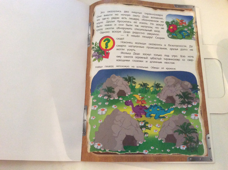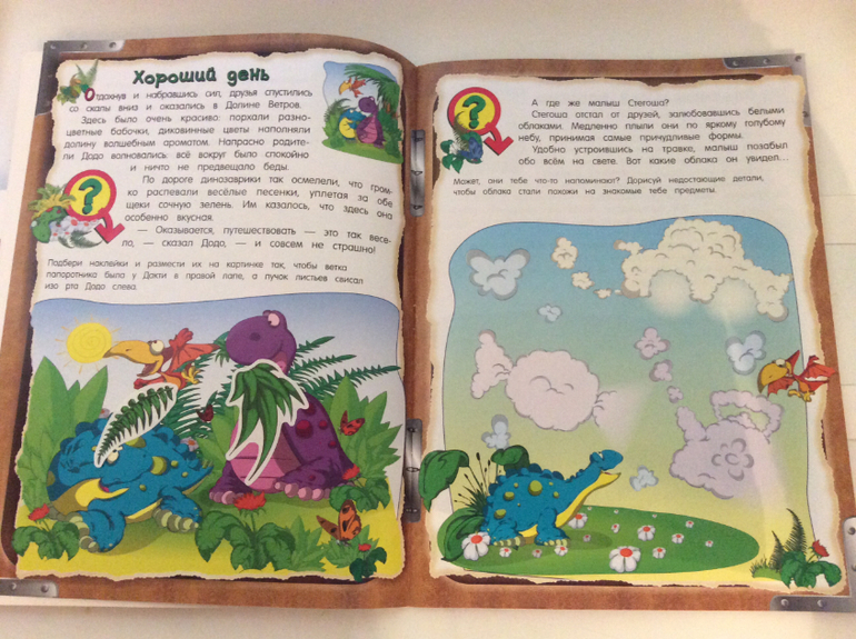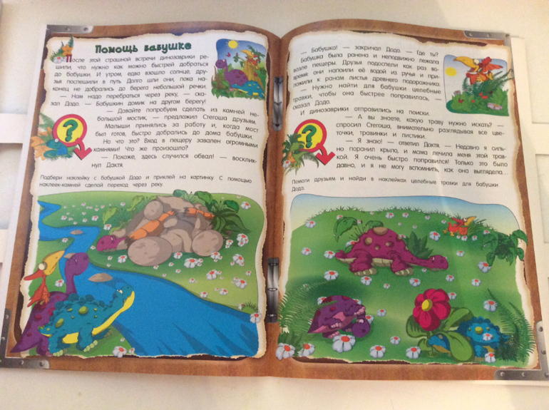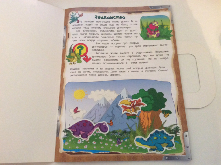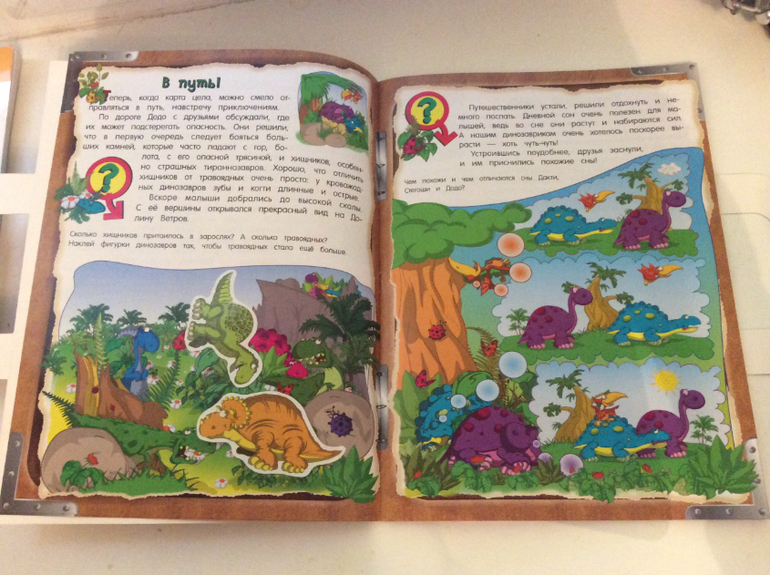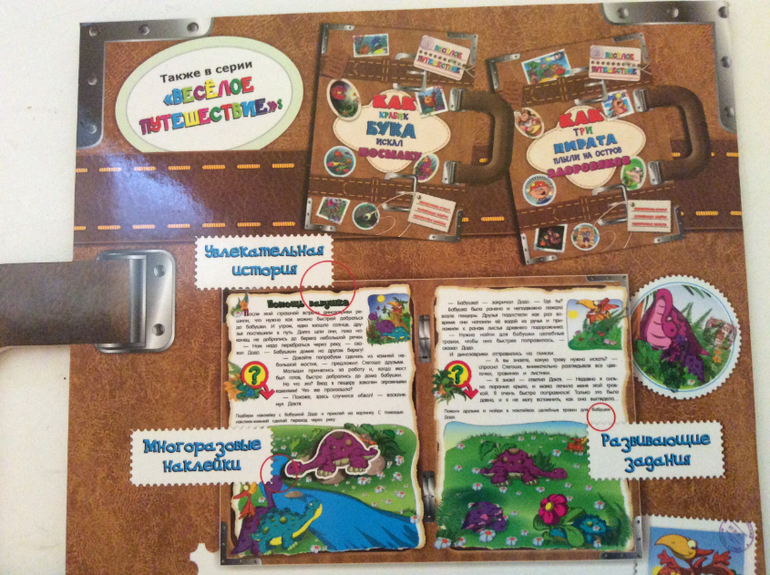Эти развивающие тетради сделаны в формате книги, рассказ идет о трёх маленьких динозавриков и как они путешествовали в гости к бабушке диплодока Додо.