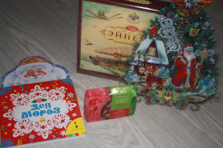 В посылочке была книжка, конфетки, наклейка, которая светиться огоньками, мыльце очень вкусное