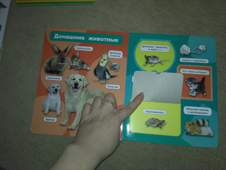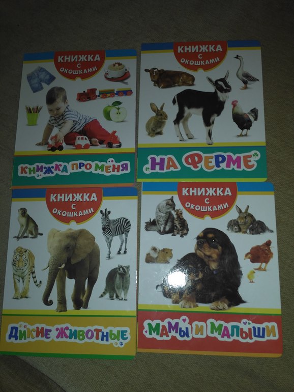 На самом деле серия больше. Есть и цифры, буквы, машины, первые слова, домашние животные и цвета и формы. Формат небольшой, на фото непонятно, но они квадратные. Картон. Плотный, и даже окошечки не настолько тонкие, чтобы их малыш мог их легко оторвать.