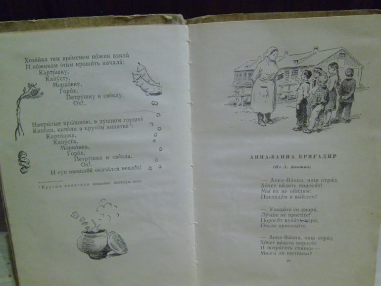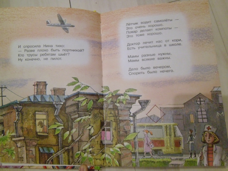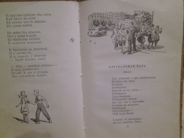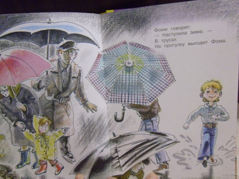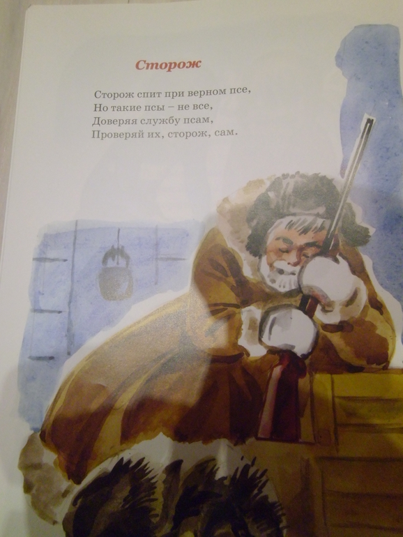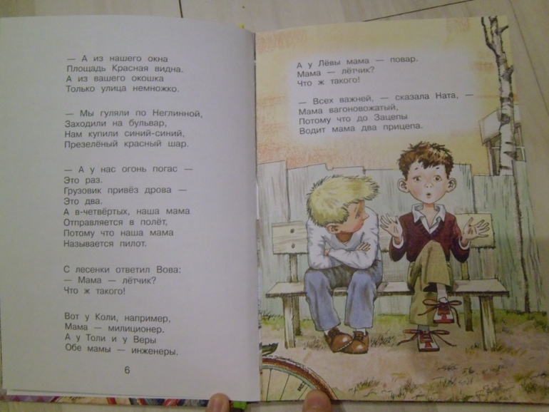По рисункам-кто на лавочке сидел могли бы нарисовать профессии,рисунков много на стихотворение,но везде дети сидят или двор нарисован.Про Фому в стихотворении по-русски написано, что он в трусах выходит на прогулку-а он в брюках.Аж бесит.Для чувствительных стихотворение есть как уточку убили,метко подстрелили.Я тупо его заклеила.В остальном хороший сборник для школьников. Цельный такой,хорошо лежит в руках.И иллюстрации очень подходят стихам Михалкова.Мы же будем читать мой старенький ч/б папин сборник. Покажу уж и его.