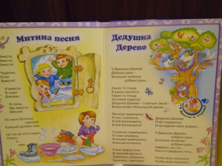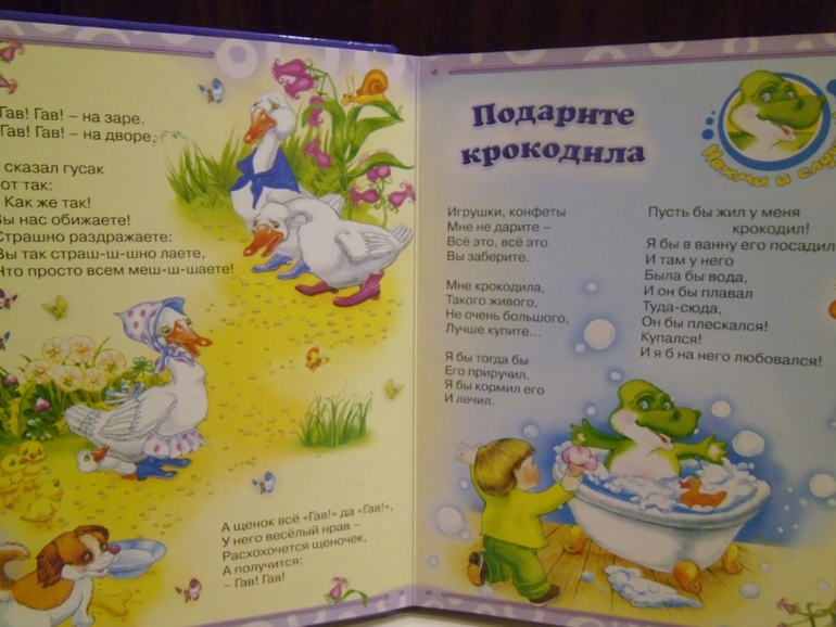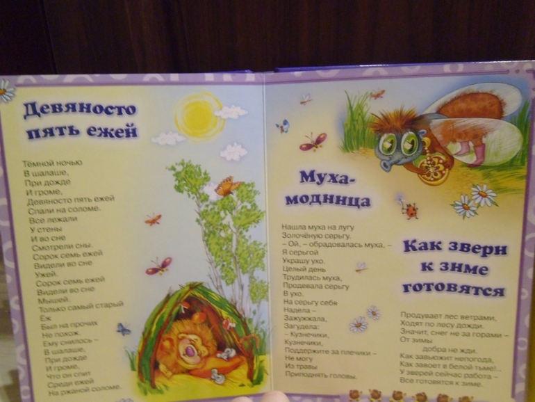 Рисунки ужас,стихи не фонтан.Если кнопку нажал,то все,обратного пути нет,пока не кончится стихотворение,книжка не замолчит.Но это даже плюс,потомучто они стихотворение дослушивают.А то на Дашиной книжке только и слышно:"ехали-ехали...щелк...дили-дили-дили-дили...щелк"и так весь день.Разворотов в интернете не нашла в свое время,выложу здесь.