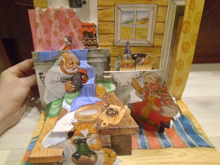 Курочка ряба.Старенькая наша панорамка,очень клевая,нравится как дом и персонажи прорисованы.А по ступенечкам мы пальчиками шагаем.Маша маленькая была, на выступающие части ставила фигурки из киндеров.Даша ищет кошку везде,курочку,показывает как яичко "паа"(упало),и как плакала бабка.