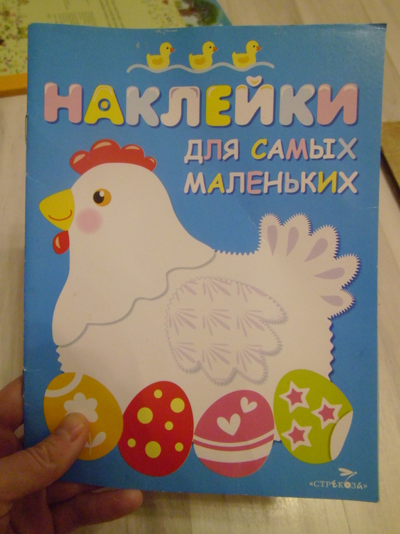 Наклейки для самых маленьких.А вот эти одноразовые.Меня неприятно поразил формат.Лучше уж за эти деньги взять издательство Стрекоза,у них тоже есть одноразовые, но формат а4,и стоит почти так же.Но девчонки наклеили с удовольствием.А Даша потом пыталась отклеить и еще раз приклеить, и книжку порвала.
