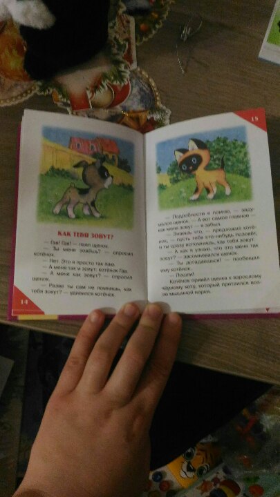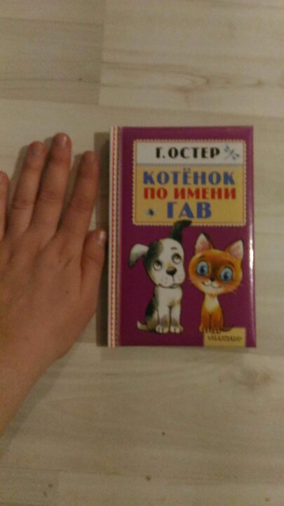 . И тут приходит посылка с другого сайта, а там "Котенок по имени Гав" и оказывается, что это книга маленького размера с классной твердой обложкой и прошитая внутри. Картинки на всю страницу или разворот, текст от одного до 5ти предложений примерно. Предложения простые и слова часто повторяются. Кира Владимировна влюбилась