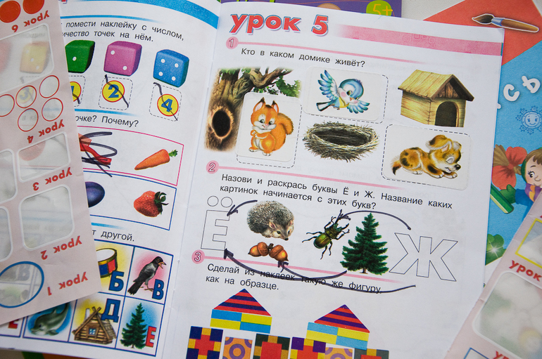 "Уроки с наклейками" Семка сразу утащил с воплями: "Давай клеить!" . Почти со всем справился, это дело он любиит)))