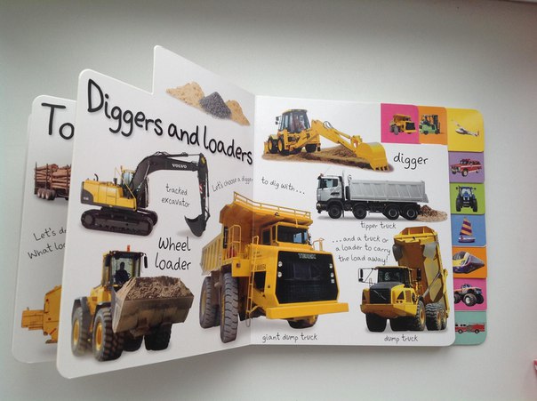 Первая книга - просто вот фото разной техники, без окошек каких-либо, с названиями, но до сих пор сын зависает с ней, учим цвета, рассматриваем детали