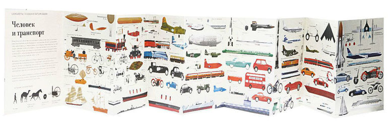 Мы предлагаем читать и рассматривать книгу 2 способами: когда она сложена, вы можете листать страницы, а если разложить ее в ленту, то история транспорта в буквальном смысле слова развернется перед вами. Кроме того, вы можете изучать рисунки, глядя на них как слева направо, так и сверху вниз. В последнем случае вы увидите, какие транспортные средства были в определенный момент времени, например в начале XX в. или в его середине.