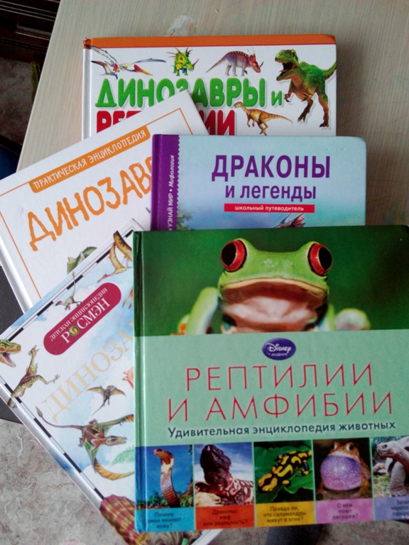 5. Это энциклопедии, появившиеся за прошедший год. Объединила их в один пункт. Ребенок увлекается амфибиями, рептилиями, динозаврами, потому и книги постоянно перечитываем, просматриваем.