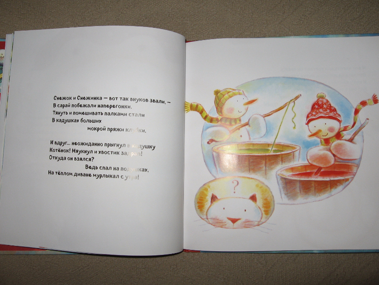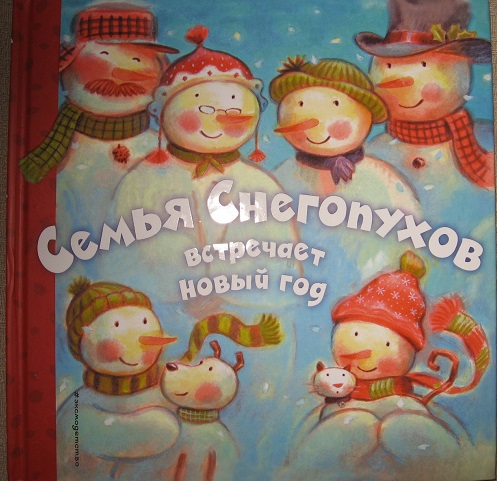 Квадратная яркая новогодняя книга, в твердой обложке, внутри мелованная бумага, много снеговиков и одно длинное стихотворение про семью Снегопухов)))