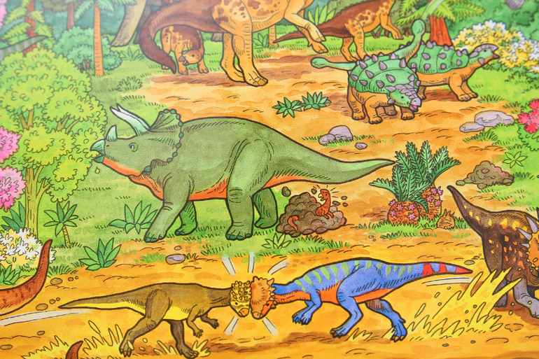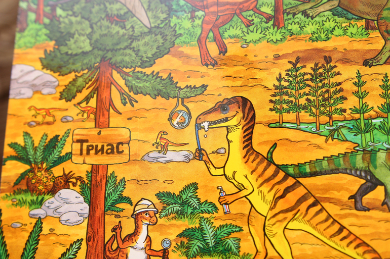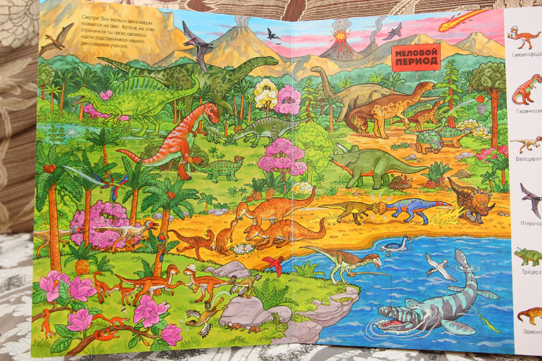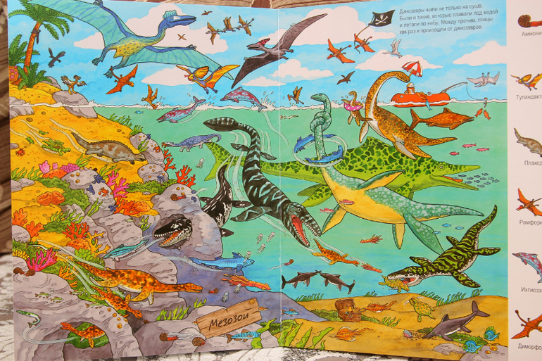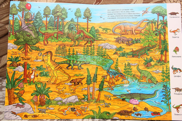 На каждом развороте вкратце дана информация и сбоку названия некоторых видов динозавров.