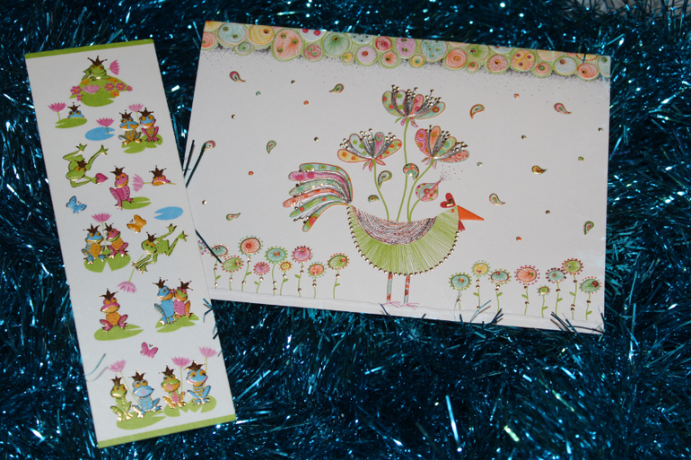 А эта красотища прилетела к нам из Израиля от Наташеньки! Вы посмотрите на этого петуха, это же павлин настоящий, а не петух, вот какой шикарный! Любовались с дочкой, трогали, щупали, шикарная открытка. А закладка вообще восторг, сразу в книгу её, без промедления. А вот наклеечки я Насте сразу не отдала, показала и всё, их ещё заработать надо))) Старается теперь, пишет в прописях, а я наклеечки по одной выдаю, если справляется с заданием))) Спасибо, Наташенька!!!!!