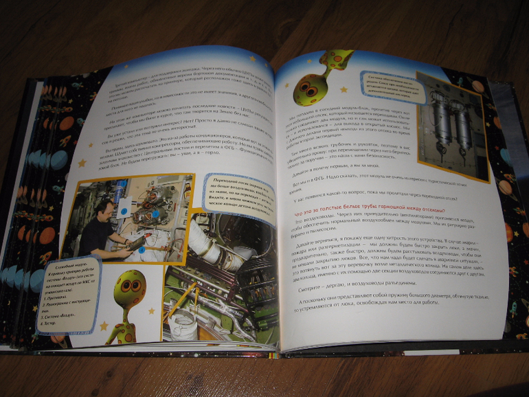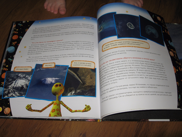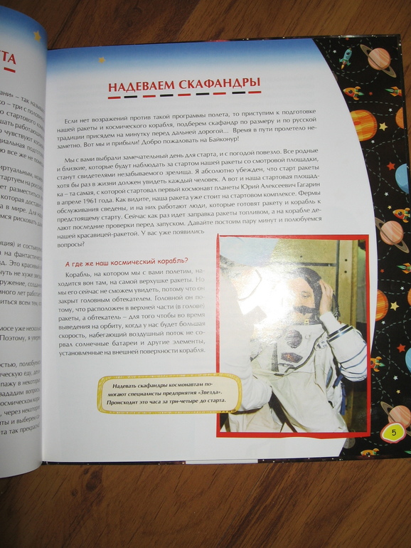 А мне книга не очень понравилась. Именно текстом. Чувствуется натянутость в повествовании, неумелое заигрывание с детьми. Сам текст неровный - иногда все по делу и в тоже время не затянуто, интересно, а иногда автора уводит куда-то и одно и тоже он по двадцать раз пытается сказать. У Юрия Усачева есть подобная книга но для взрослых, о его полетах в космос. Там написано гораздо интереснее и легче по слогу. Но той книги давно нет в продаже. Я ее покупала на подарок, открыла и не удержалась - прочла всю - так было интересно. Эту же книгу читать местами действительно тяжело, купила так как действительно для детей подобного нет.