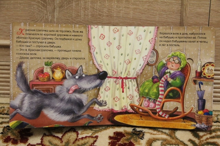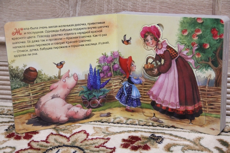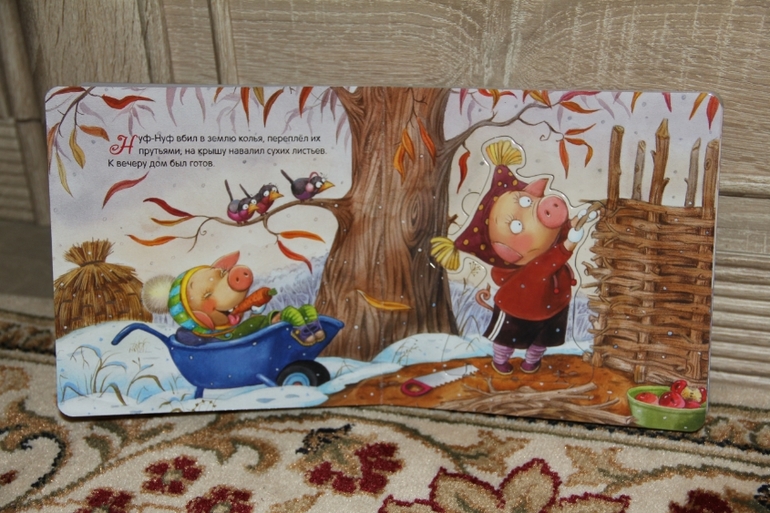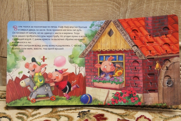 Обычно при чтении сын вырывает книгу у меня из рук или уползает. А я все не теряю попытки вовлечь сына в прекрасный мир сказок, стихов. И как же хорошо, что я схватила этих поросят. Теперь я читаю сказку от начала до конца. А все потому, что как только я начинаю читать страничку, я вручаю сыну пазл-героя. При этом скажу кто это, если волк, то еще и порычу и повою на луну, если поросенок, то хрю-хрюкаю. Платону очень это нравится и он начинает улыбаться во весь свой рот. Пока я читаю, он увлеченно рассматривает и крутит в руках героя из сказки, иногда, конечно, пробует и на зубок. Пазл толстенький, смять не возможно. Как только сказка заканчивается мы с Платоном вставляем пазлы на место, ну как вставляем, руковожу и направляю его руку.