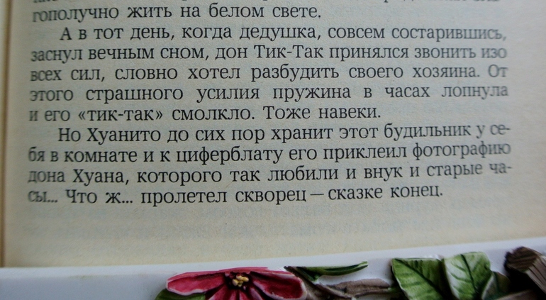 Дон Хуан и Хуанито очень любили друг друга. А дон Тик-Так заботился о них как мог: старался тикать чуть слышно, чтобы дать дедушке подремать, а внуку спокойно делать уроки, «забывал» будить мальчика в школу, когда на улице была уж очень холодная зима, а дедушку подгонял, чтобы тот ложился пораньше. Однажды летом он зазвонил среди ночи, чтобы спугнуть вора, и тот, перепуганный, бежал что есть мочи, так ничего и не взяв) А в другой раз он спровадил весьма неприятного сеньора, который дурно отзывался о Хуанито.