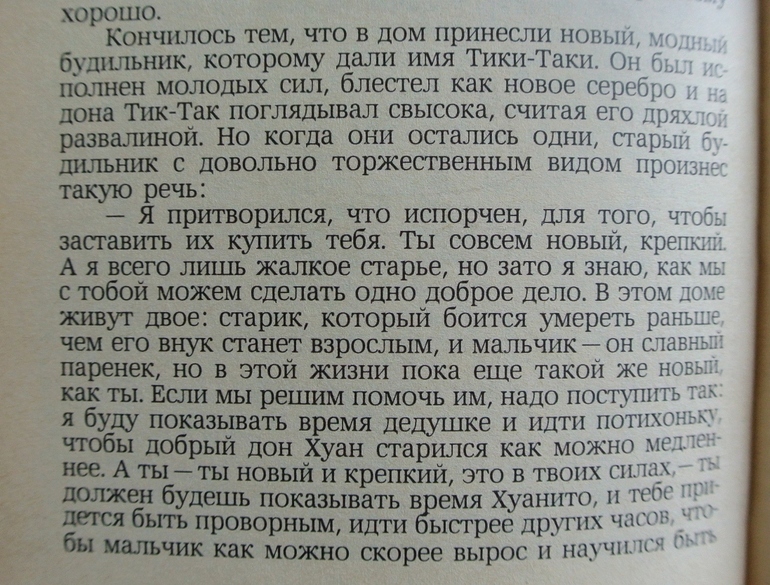 Будильник, поразмыслив, решил: идти медленно - это хорошо, «дедушка не старится, но ведь и мальчик не взрослеет». Тогда он стал идти быстро-быстро, чтобы Хуанито успел вырасти. Так и вышло, да только дедушка совсем потерял силы и стал падать духом…