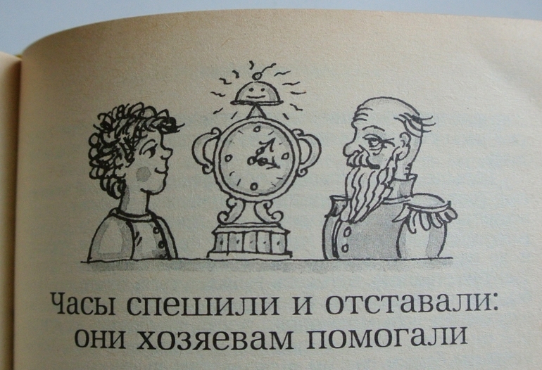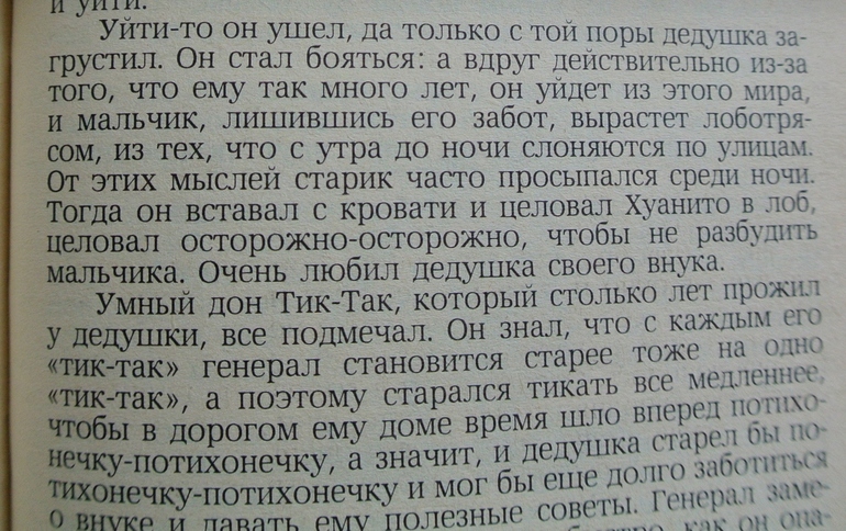 "Само собой разумеется, что мальчик рос, а дедушка... дедушка старился, но, несмотря на это, в их комнате все время исправно стучали три сердца, а именно: дедушкино, внука и будильника".