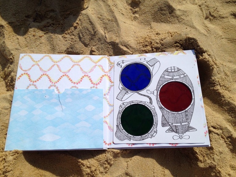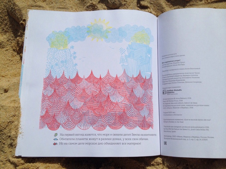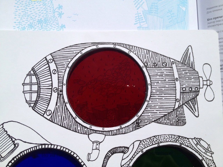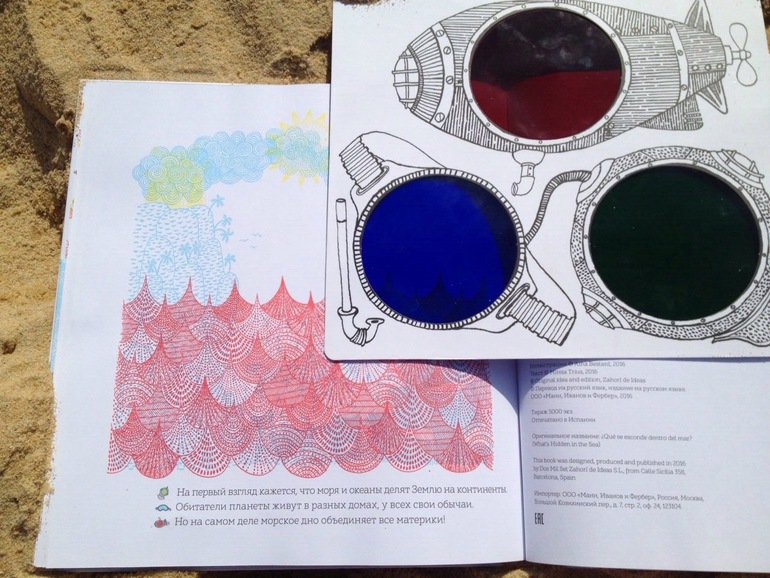 Когда начинаешь листать книгу и всматриваться в картинки, то на первый взгляд кажется, что художник изобразил какое-то безумное сочетание черточек, точек, пятен. Потом, присмотревшись внимательнее, видишь, что все это безумие складывается в морские пейзажи, картины подводного мира, но для чего художник это сделал? Ничего не понятно.))) Но тут достаешь из широких штанин из кармашка на форзаце лист с цветными окошками, и начинается волшебство…