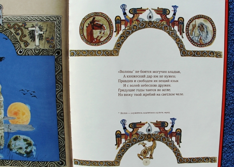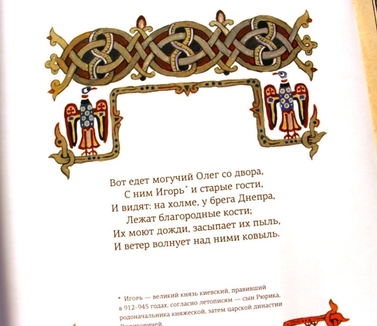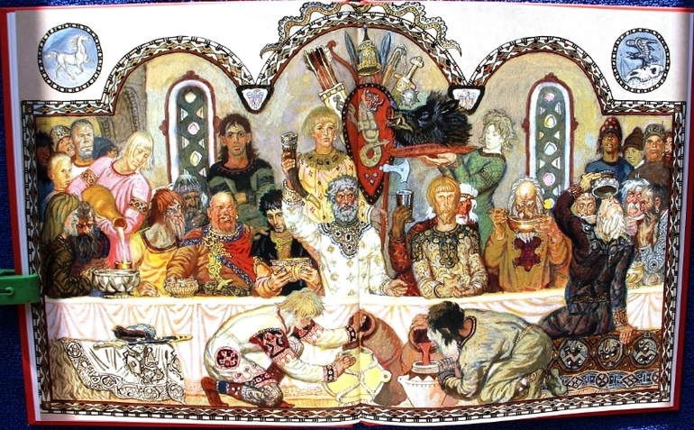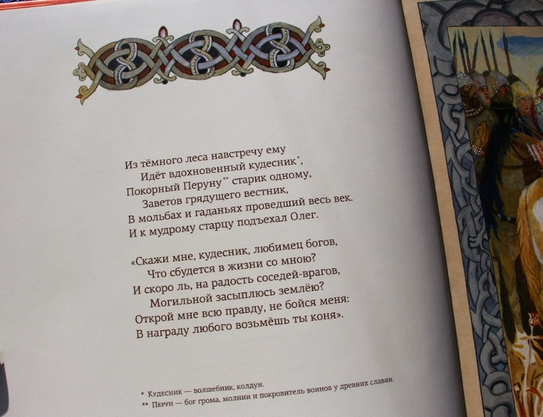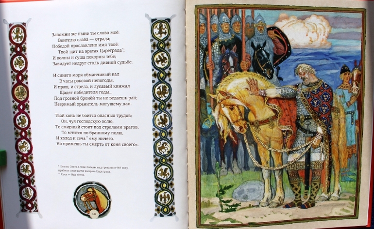 Может купила из-за сына, помешанного на сражениях, зная заранее, что книга ему понравится. Хоть сражений в ней и нет, но есть мечи, копья, стрелы, воины - «маленькое сражение» сказал сын. А может и скорее всего из-за длинной истории ожидающей эту книгу, ведь читать дети ее будут по школьной программе. Не буду в очередной раз писать про тяготы школьной жизни, но точно читать такую красочную книгу будет проще, чем учебник. Да и знакомое с детства произведение будет понятнее и легче запомнится.