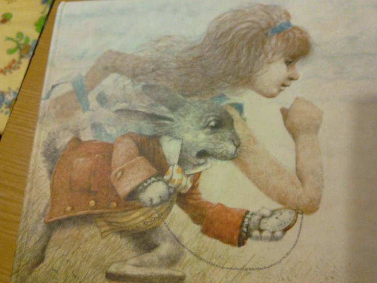Даже ходить далеко не пришлось. Это Алиса в стране чудес навырост для Алисы:) С ее кроликом с часами.