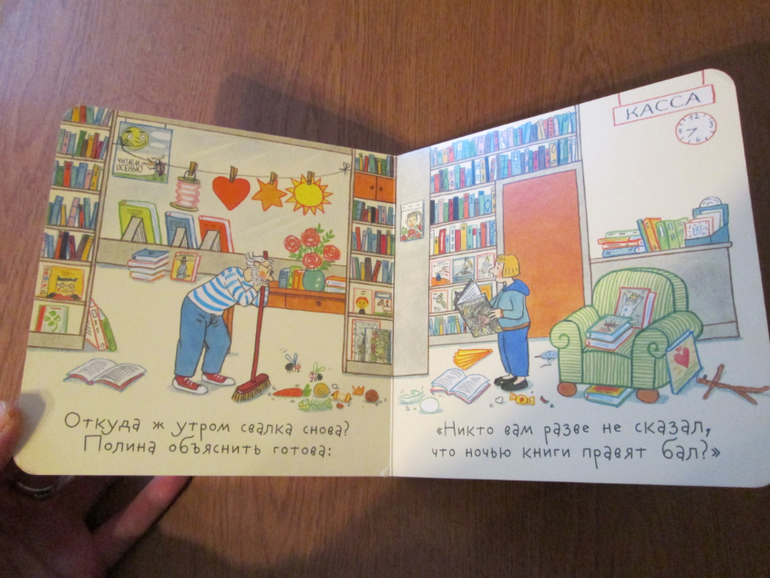 Ну и про Полину расскажу. Там история про то, как Полина читала-читала книжки, всюду и везде и встретилась со столбом! Из-за шишки доктор запретил ей чтение. Доктор ушёл и она сразу достала книгу. И вот она мечтает, чтобы книжки сами парили над глазами, чтобы не надо было их в руках держать)))