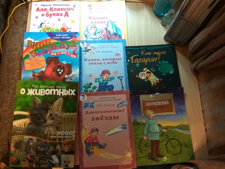 Ну и... гм... космос, космос, космос! :) Я упёрла из библиотеки ВСЕГО Левитана, какого нашла. Ещё одну книжку он читать отказался, так как читать скучно - уже всё знает.