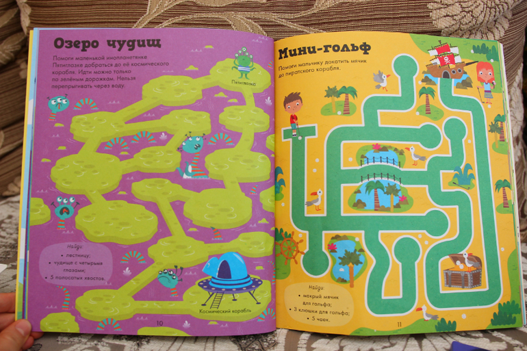 Сказать, что я угадала и попала в яблочко, это ничего не сказать. Несколько дней над ней залипал. Иногда даже сам! ОДИН!!! Сейчас очень часто к ней возвращается. В книге не только лабиринты, на каждой страничке есть несколько заданий - находилки на счёт, на цвет и т.п. Сын уже всё выучил, поэтому сочиняю ему задания из головы.