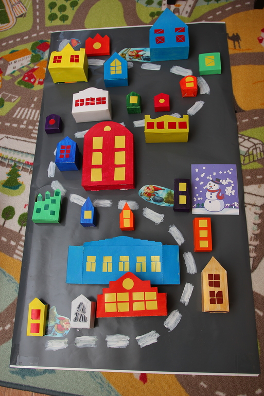 Вот такой у нас был адвент-календарь. Успела щелкнуть целиком перед отправкой его на мусорку. Каждое утро на дороге к мешку с подарками появлялся новый домик. А в домике вкусняшки, книжки, наклейки, игрушки и всякая чепуха.