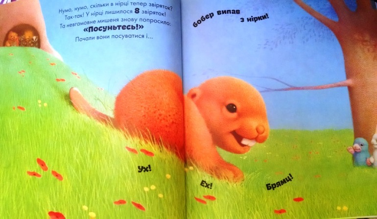 Я эту книгу не люблю - до сих пор не могу запомнить, что синее - это белка, фиолетовое - это крот, розовое с ушами как у кота - это медведь. А дочка любит - потому что все эти неопознанные звери нарисованы мимимишно, а еще потому что книга про нарушителя правил поведения. А к нарушителям у нее повышенный интерес и кредит доверия. После прочтения она начинает дурачиться и толкаться.