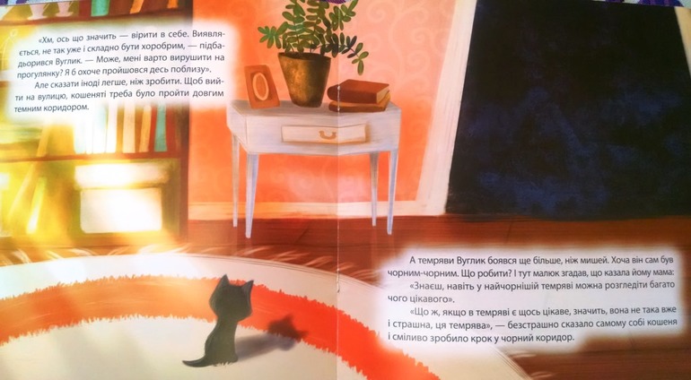 Кошеня. Сюжет: Котик боялся темноты и старого котяру, но превозмог свой страх и теперь не боится.