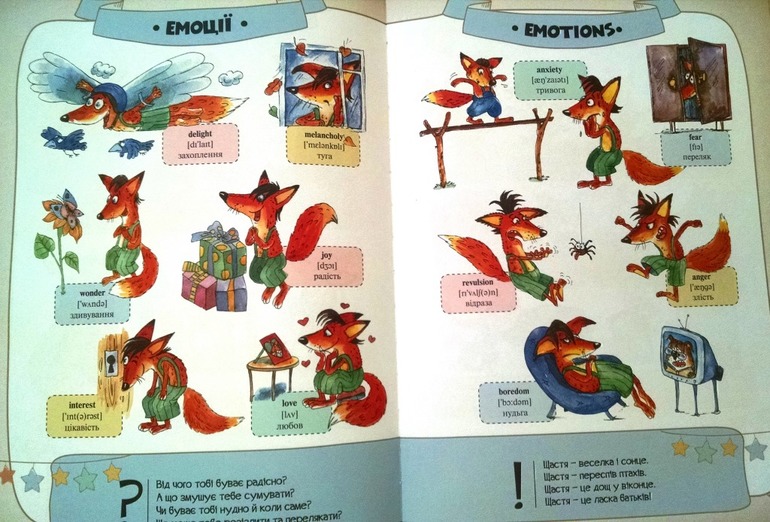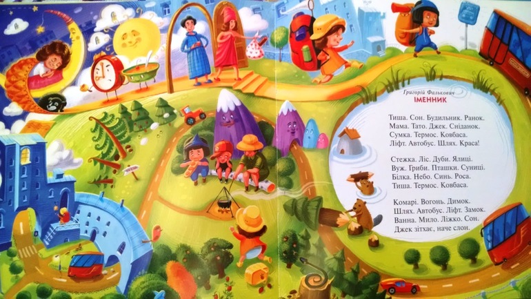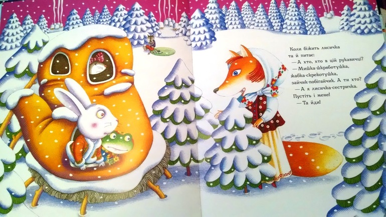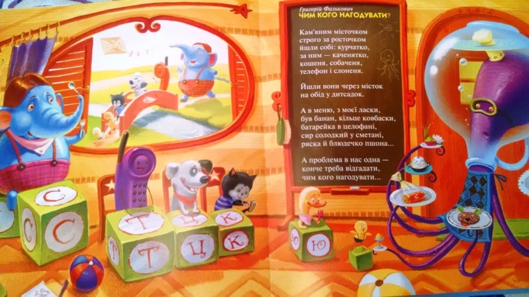 Это такая книга-перевертыш. Читать надо с 2 концов. Стихи, я бы сказала, будут понятны от 3-3,5 лет до школы. Часть из них есть в двухтомнике Улюблені вірші. Мне этот момент был не очень приятен. Ну хоть картинки другие подобрали, и на том спасибо.