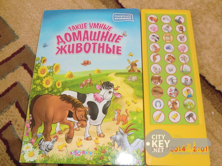Азбукварик " Домашние друзья", там фото домашних животных, и информация о них в стихотворной форме, правда, сейчас выпускают уже новый вариант, меньше форматом, зато звуковой модуль в виде смартфончика, которым можно играть отдельно.