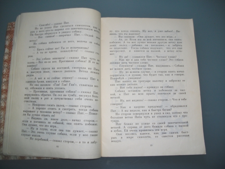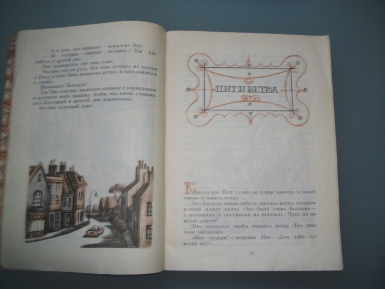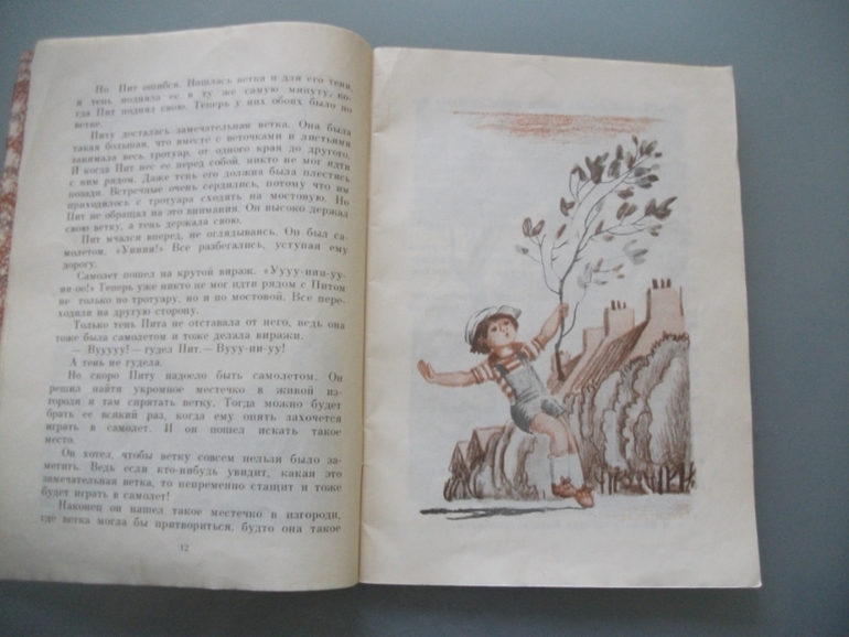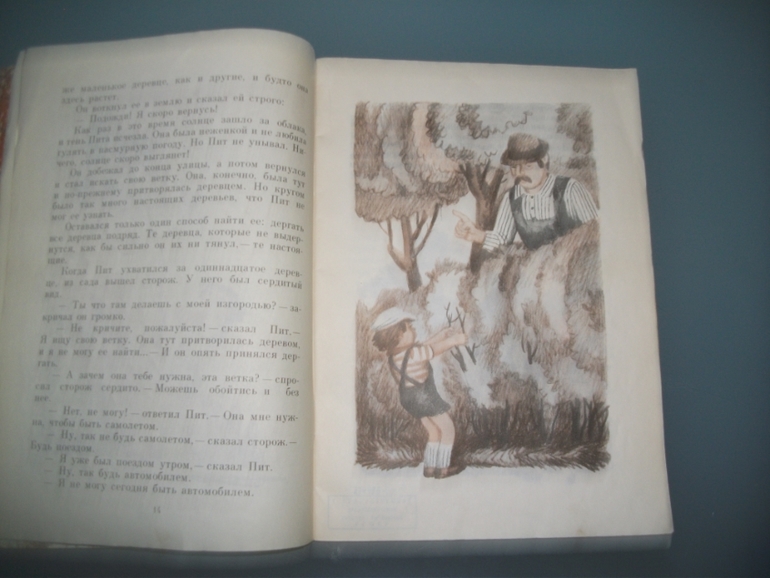 Потом Пит эту ветку спрятал в кустах в парке, вдруг она ему пригодится еще, Но найти эту ветку Пит потом не смог и стал тянуть все кусты в парке, надеясь ее отыскать. Но тут пришел садовник парка и помог мальчику. Интересен сам разговор ребенка и взрослого,