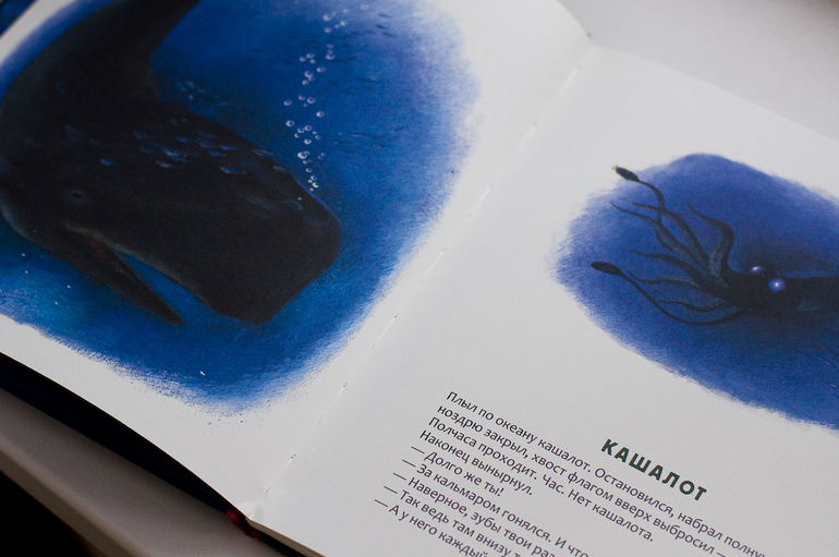 «Кто в море живет» Сахарнова. И все-таки Устинов - гений. Его иллюстрации поразительно живые, насыщенные. А еще удивительно реалистичные. Смотришь на картинку и будто перед тобой не книга, а стекло подводного аппарата. И вот он, кашалот, только руку протяни, но между вами толстое стекло… Стоп. Только бумажный листок.