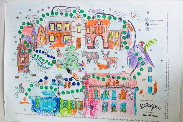 А еще котофеев мы рисовали. Папа привез нам вот такое чудо прям перед новым годом, и мы с Семычем, склонившись, раскрашивали дома и любимых персонажей. Поиграли пару раз, теперь висит как плакат. Красиво)