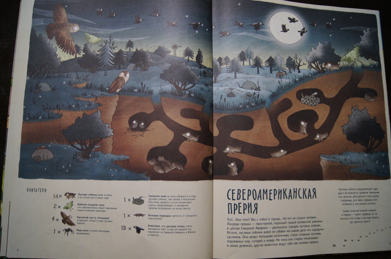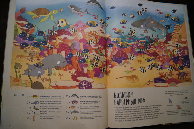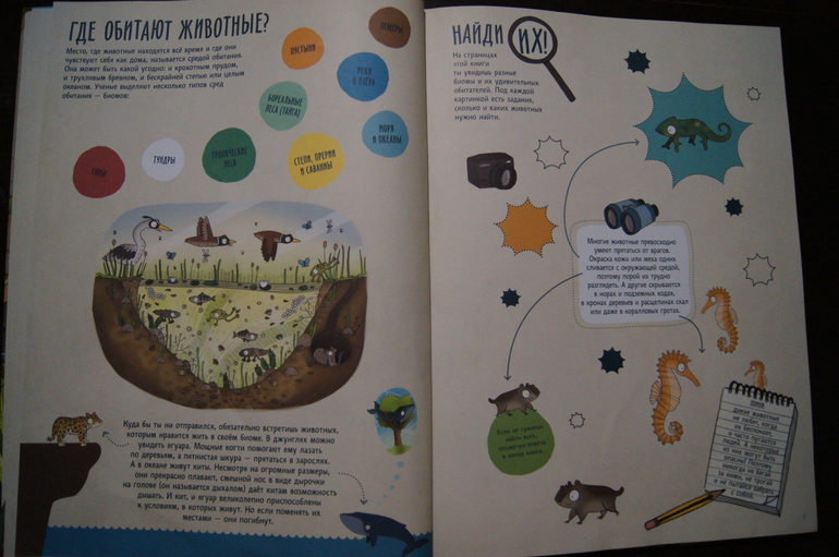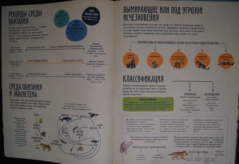 Во-вторых, расскажу про элементы энциклопедии. Название говорит само за себя, так что это энциклопедия о животном мире. Начинается книга с понятия «среда обитания», которая плавно перетекает в карту мира с подробным маршрутом, фактически кругосветная поисковая экспедиция не выходя из дома. Мы пройдем путь от тундры Гренландии до снегов и ледников Антарктиды, по пути заскочим в прерии и Долину Смерти в Северной Америке, в пустыни Гоби и Намиб, погрузимся на глубину 2500 метров в Тихий океан, узнаем, что даже на такой глубине в абсолютной темноте есть жизнь, заглянем в русскую тайгу и австралийскую полупустыню, порелаксируем у японских горячих источников, поплутаем в Амазонском дождевом лесу, скажем фууу ужасному запаху в пещере Гомантонг, нырнем в озеро Байкал, то есть побываем в разных средах обитания животных.