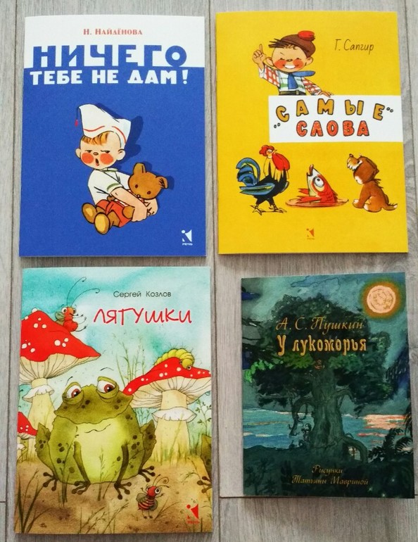 Наши новые книжки от "Речи". Очень понравилась сыновьям "Ничего тебе не дам" Н. Найденовой про маленького мальчика Витю, который не хотел делиться игрушками. И понравилась "Лягушки" Сергея Козлова оформлением, иллюстратор Виктория Кирдий. Не являюсь ее поклонницей, но книжечка хорошая, именно рисунками хорошая. "У Лукоморья" с илл. Татьяны Мавриной стала разочарованием для меня...Всем хороша, но размер...Я не ожидала, что она такая крохотная...))