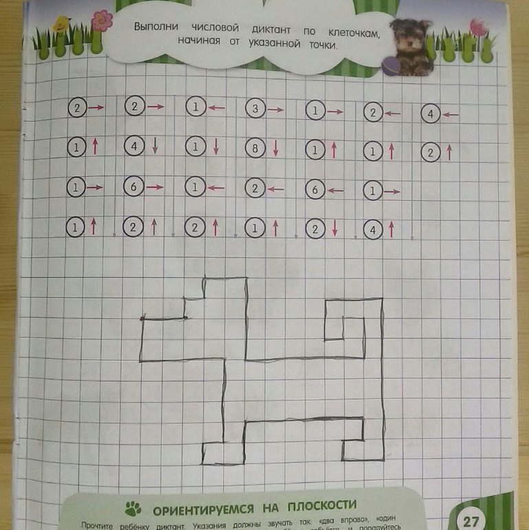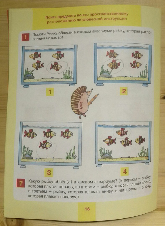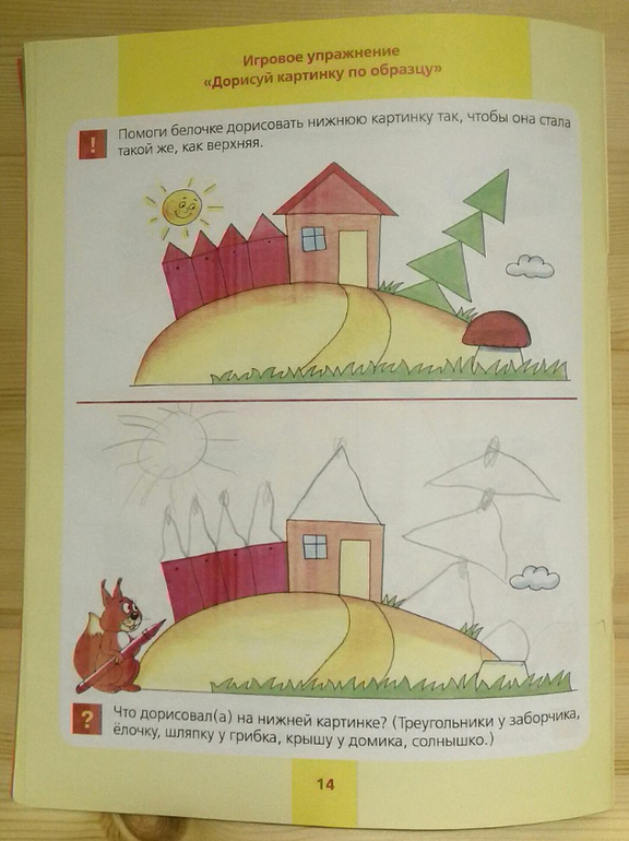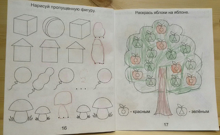 В тетради много упражнений на поиск предмета по величине, цвету, количеству и даже пространственному расположению. Ребенку предлагается найти различия между картинками, пройти лабиринты и дорисовать рисунок. Самое интересное задание, на мой взгляд, найти, что перепутал художник. Впервые мы с ним столкнулись в этой тетради. Дочка долго удивлялась, что за непутевый художник рисует летающих собак и яблоки на елке.