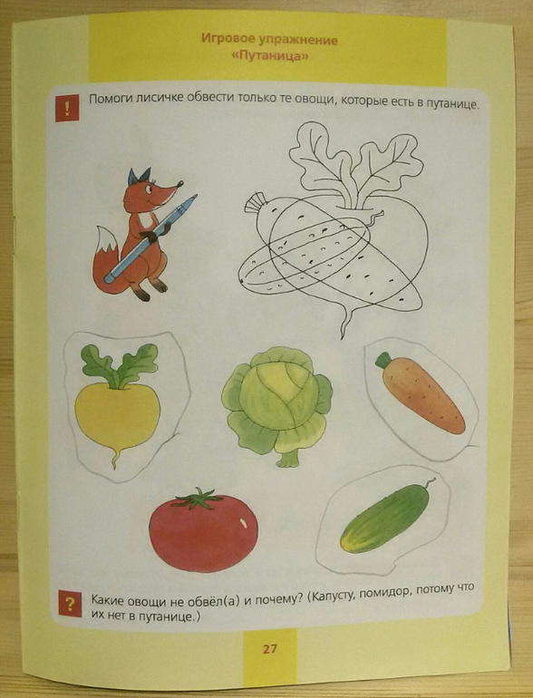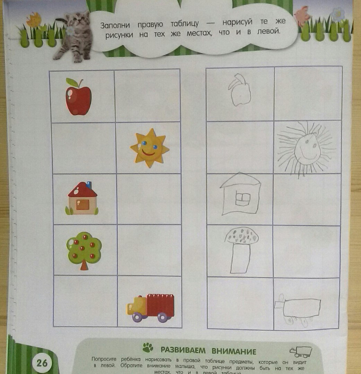 Только сейчас заметила, что эта тетрадь у нас только в первой части. Почему не купила вторую, не помню. А может просто хотела, но забыла. Сама тетрадь черно-белая, предназначена для письма и раскрашивания. Упражнения направлены на развитие внимания и мышления. Также отрабатывается мелкая моторика, то есть координация движения руки. Все задания абсолютно разные. В одних нужно соединить линией подходящие рисунки. В других, найти точно такой же предмет как в рамке. Есть упражнения, в которых нужно продолжать логические ряды и раскрашивать картинки по-разному.
