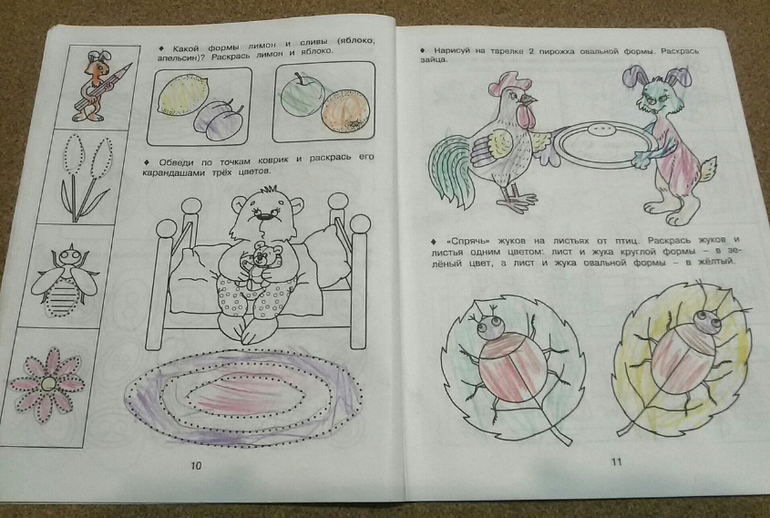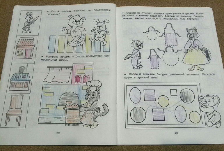 Большинство заданий тетради предполагают работу с цветными карандашами. Упражнения достаточно однотипные: обведи по точкам и раскрась, но понятия фигур закрепляет хорошо.