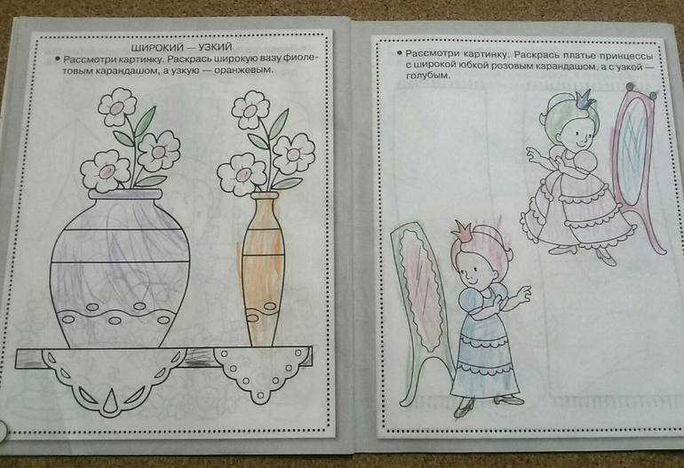 Следующие две тетради как раз пришлись на конец трех - начало четырех лет, поэтому начну с них. Сразу отмечу, что задания в тетрадях мы выполняем простым или цветными карандашами. И если ребенок дает правильный ответ и может его объяснить, но не хочет раскрашивать картинку, хотя того требует задания, я не заставляю. Мы просто обсуждаем и переходим к следующему упражнению.
