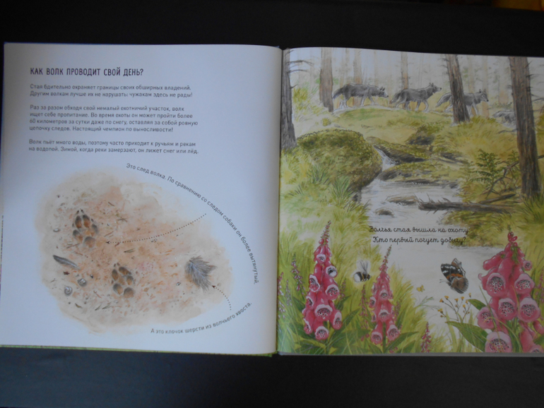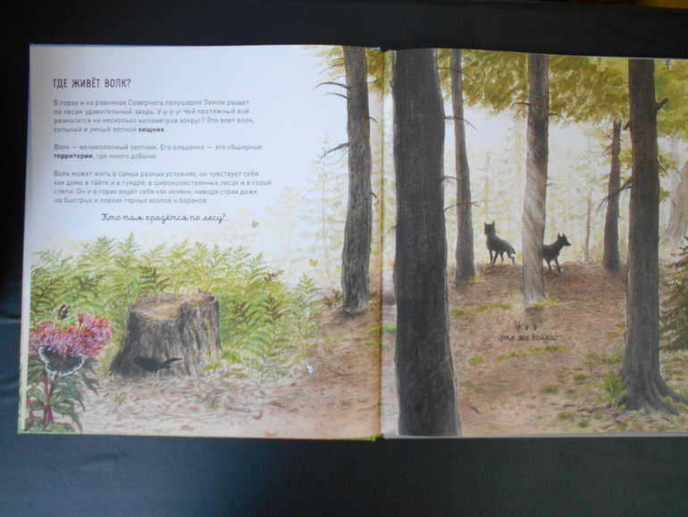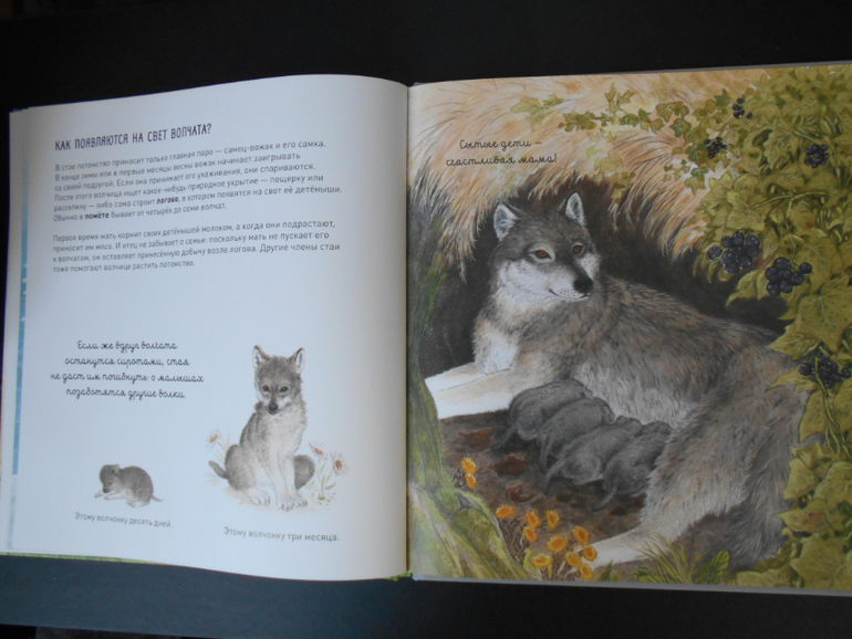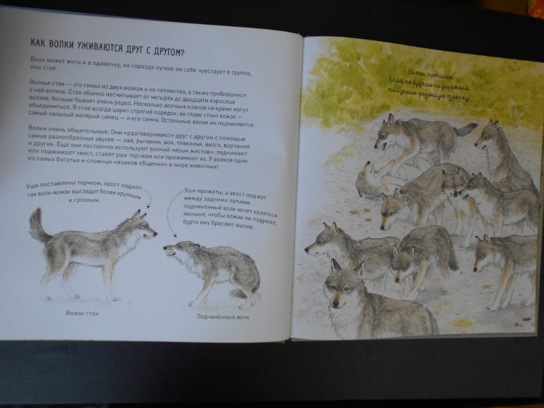 А ещё у волков самый богатый язык общения - они общаются друг с другом и воем, и рычанием, и ушами, и хвостами. Вообще волк - очень умное животное. В конце книги есть словарик и изображение сородичей.